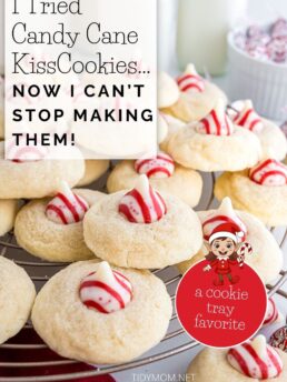 These soft, buttery Candy Cane Kiss Cookies, also called peppermint blossom cookies, are a festive holiday favorite. Each cookie is rolled in sugar, baked until just set, and topped with a pretty peppermint-striped Kiss that melts slightly into the warm cookie. They’re cheerful, simple, and perfect for cookie trays, parties, and holiday gifting….peppermint season never tasted so good.