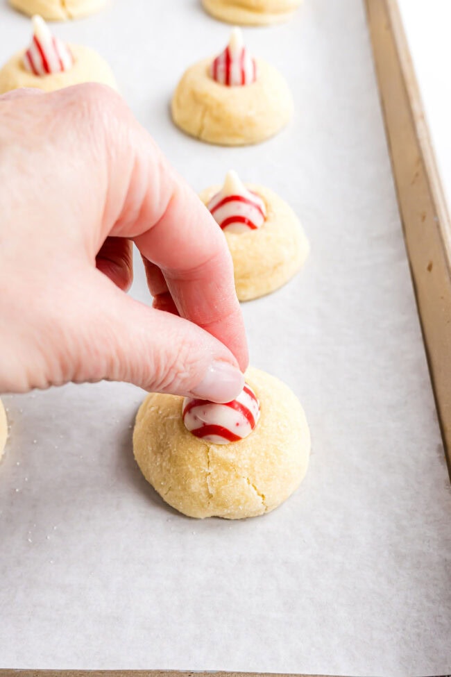 - Bake, then press a candy cane Kiss into each warm cookie.