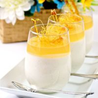 FIVE: Divide the gelatin mixture over the panna cotta evenly among the glasses. Chill until set, at least one hour. Garnish with spun sugar or single toasted almond slice inserted into the center of the gelee.